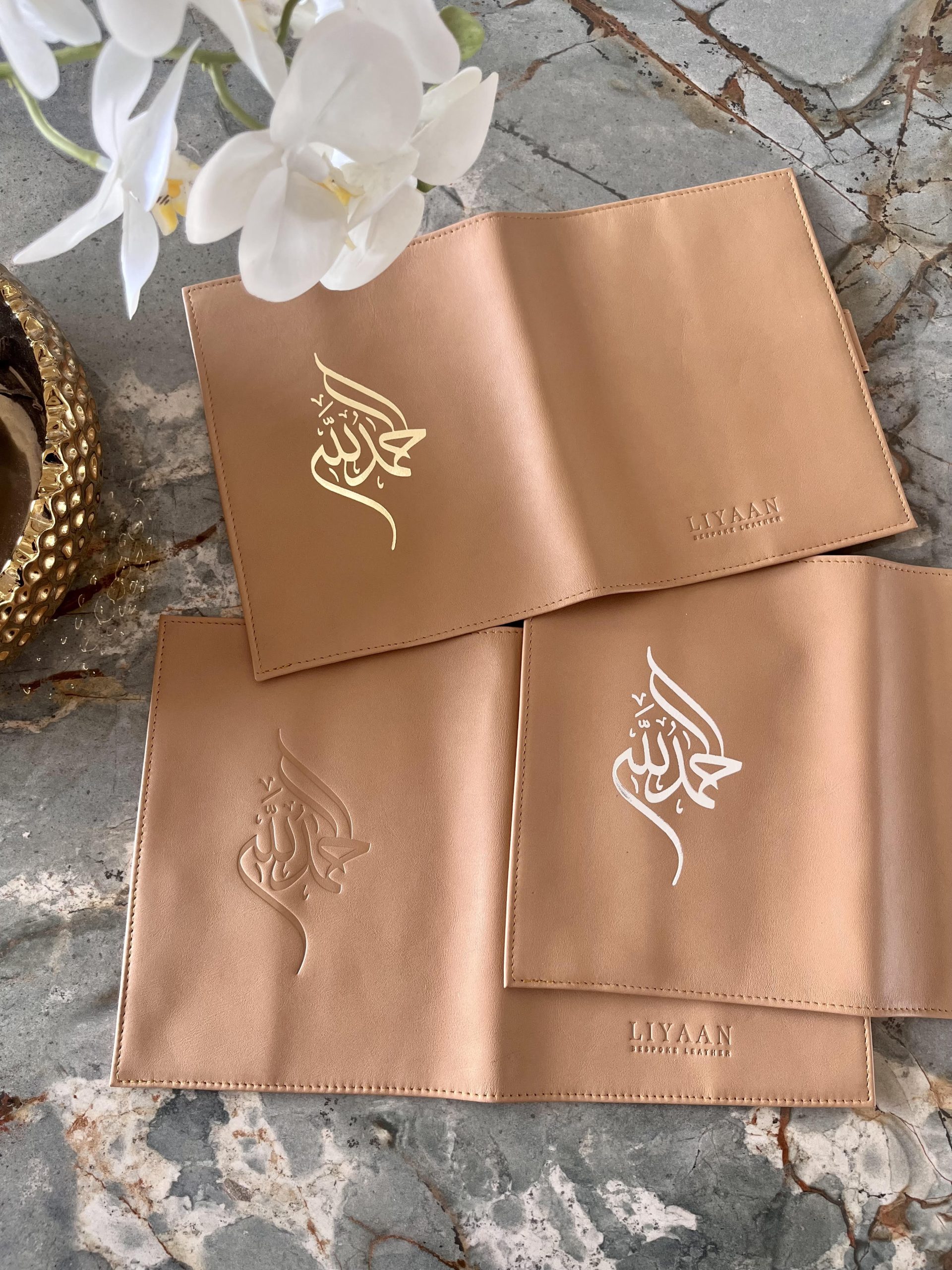 Front of the cover is embossed with Alhamdulliah in arabic Calligraphy with an option of gold/silver foil or no foil (plain embossing