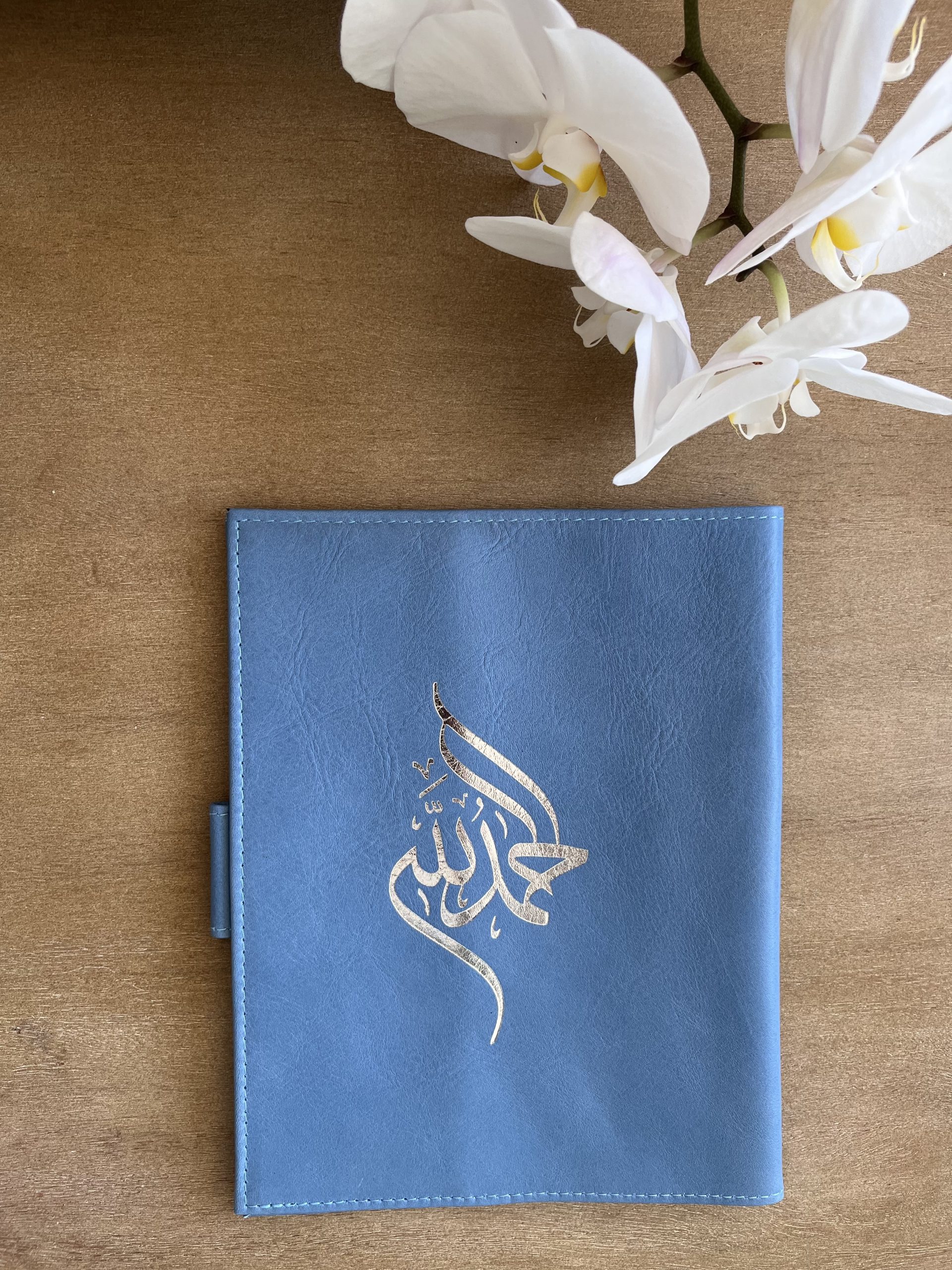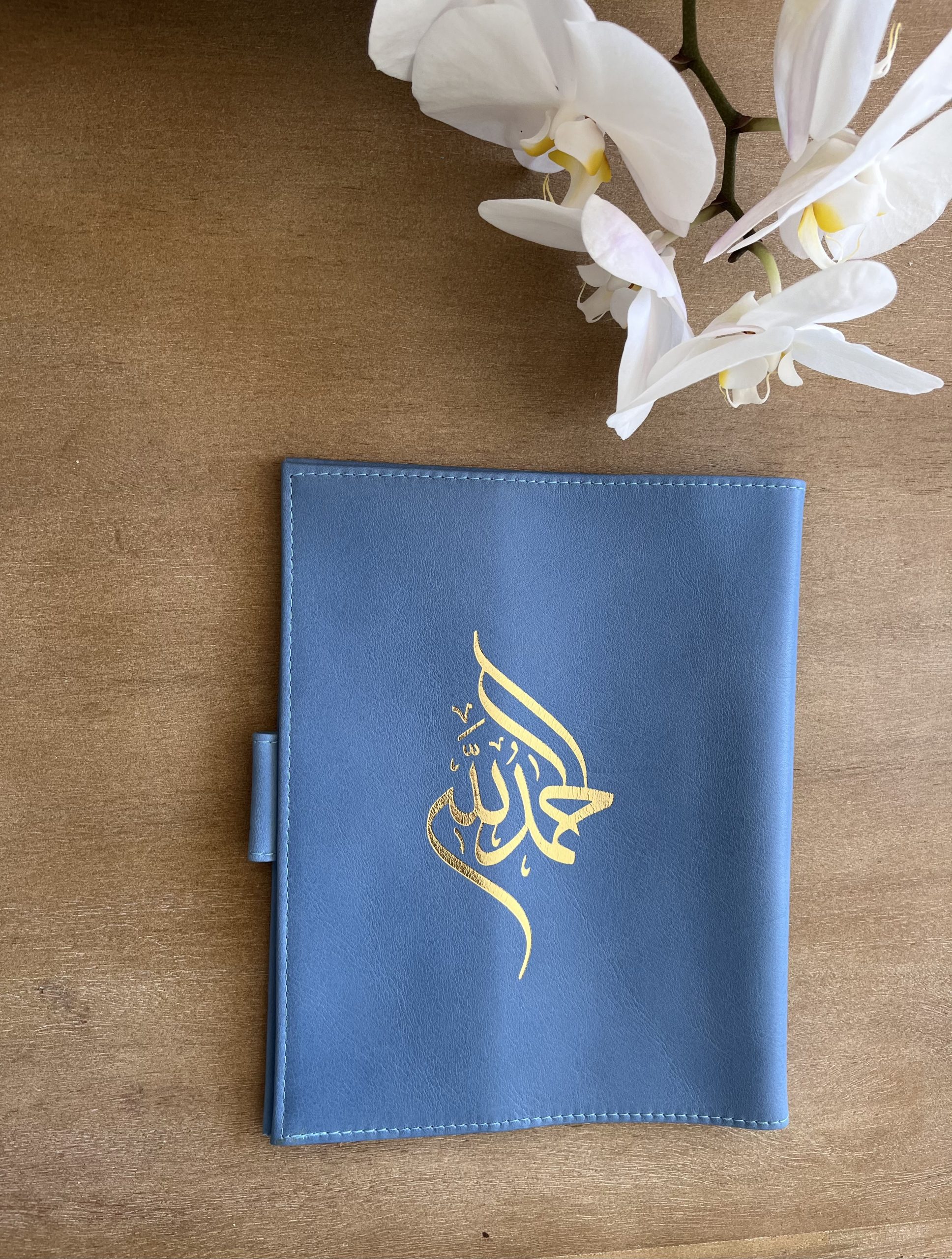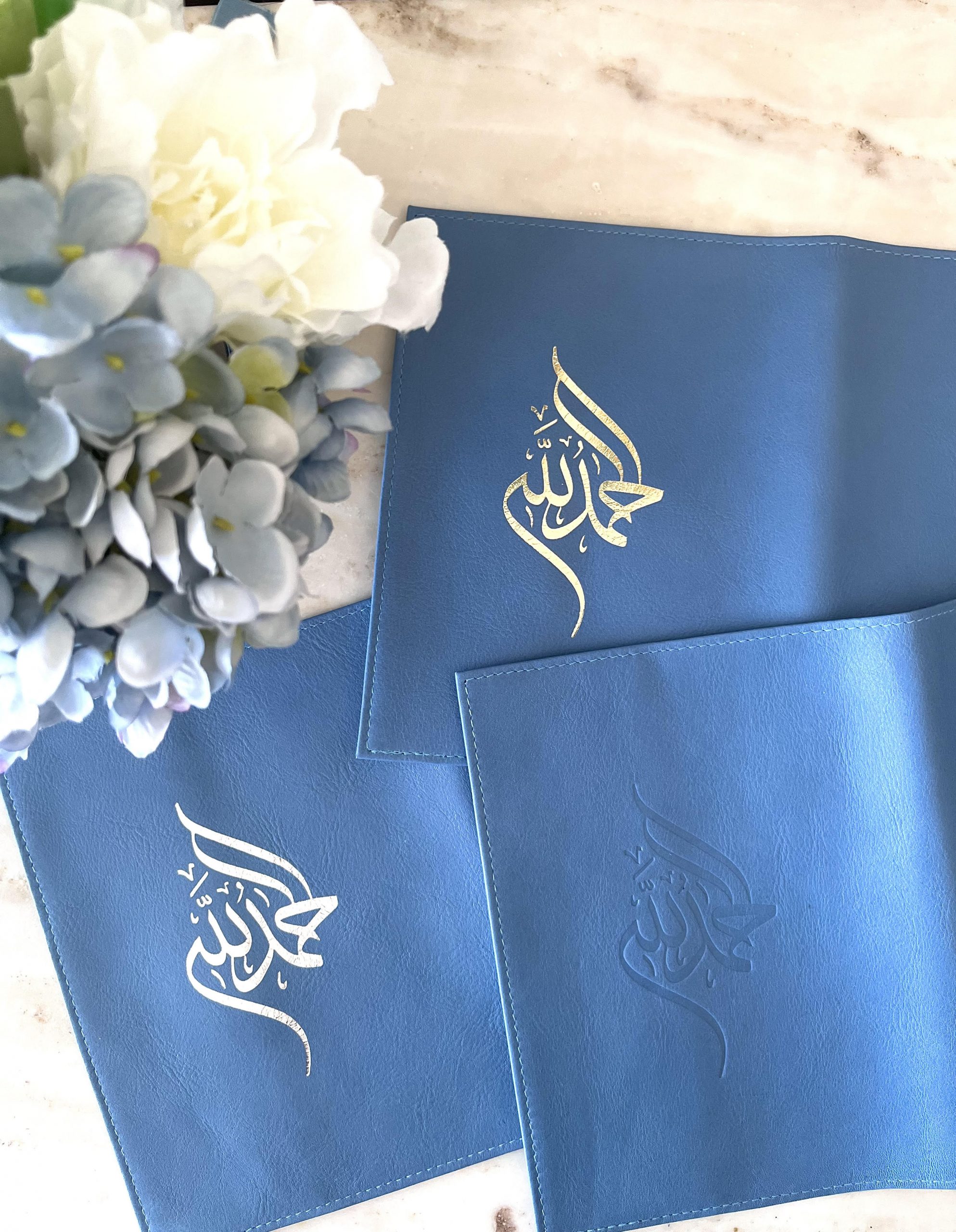 Front of the cover is embossed with Alhamdulliah in arabic Calligraphy with an option of gold/silver foil or no foil (plain embossing)